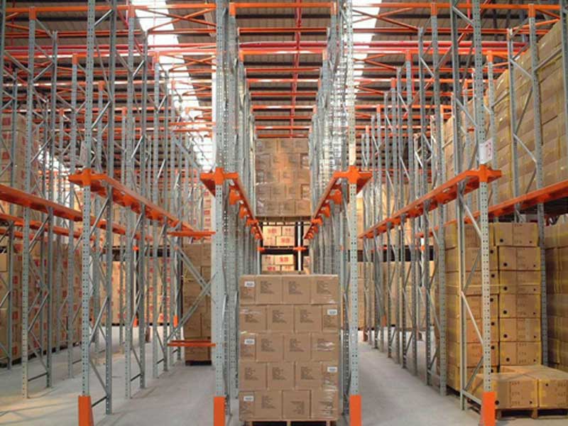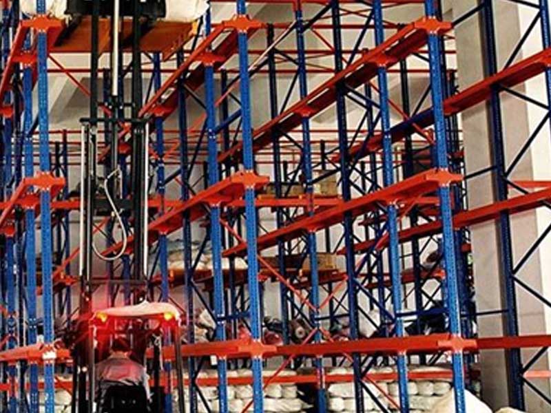 叉车驶入货架内部存取货物,与横梁式货架相比,空间利用率可提高30%以上。单面取货时无法先进先出,所以通常不超过7个货位深度。为提高叉车运行速度,可选配导向轨道